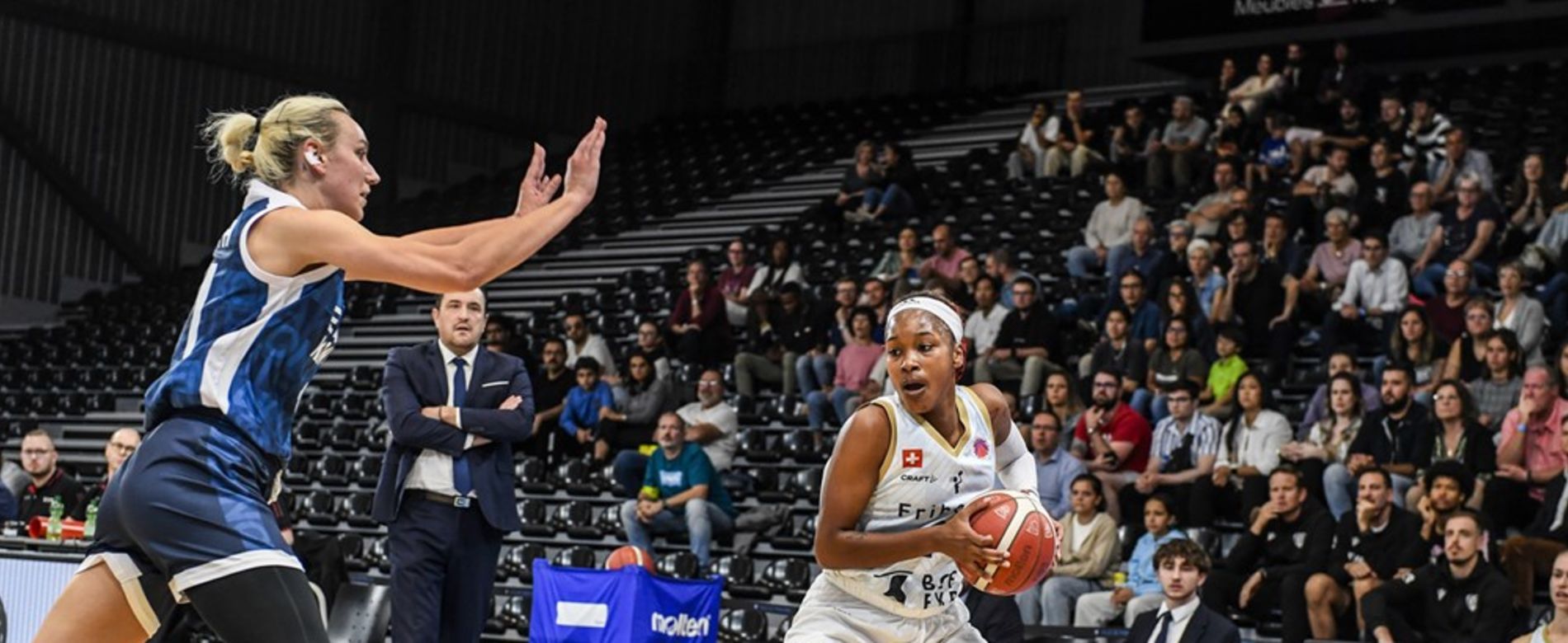 BCF Elfic Fribourg a parfaitement négocié son premier rendez dans ce groupe L de la FIBA EuroCup Women en s'imposant à domicile face à l'équipe turque de Emlak Konut SK sur la marque de 82 à 71. D'autant plus important que les elfes n'ont pas un calendrier favorable avec l'enchaînement dorénavant de trois rencontres en déplacement. Dans l'autre match les françaises de Roche Vendée Basket l'ont emporté à domicile face aux polonaises de VBW Arka Gdynia. Les fribourgeoises ont très bien entamé le match avant de connaître une période très difficile dans le 2ème quart-temps suite à la sortie momentanée sur blessure de Abigail Fogg et les fautes qui ont accablé Miriam Uro-Nilie. Une deuxième période où les joueuses de Romain Gaspoz ont su faire la différence repoussant tous les assauts des joueuses turques. Les elfes se sont montrées meilleures à 3pts à 9 sur 27 contre 5 sur 23 et également collectivement 23 assists contre 15. 45 rebonds contre 37. Elles ont souffert face à l'intérieure australienne Alanna Smith qui a porté à bout de bras son équipe. Les fribourgeoises ont connu le meilleur départ dans ce match menant 19 à 5 à la 7ème ne manquant quasiment rien. Dès ce moment-là la sortie de Abigail Fogg a sérieusement freiné les ardeurs fribourgeoises. Les turques en ont profité pour renverser complètement la situation dans le 2ème quart-temps derrière une Alanna Smith intenable et auteure de 14 pts en l'espace de 10 minutes. Le score est passé de 27 à 15 à 33 à 38 à la 18ème. Partiel de 6 à 23. 37 à 40 finalement à la pause. Retour bienvenu de Abigail Fogg dès le début de la seconde période qui a permis de stabiliser le jeu intérieur fribourgeois. L'équipe turque a encore mené jusqu'à la 27ème, avant que Marjorie Carpreaux ne redonne l'avantage aux elfes sur un panier à 3pts, 52 à 49. 56 à 53 à l'entame du money-time. Les joueuses de Romain Gaspoz ont creusé rapidement un écart de 8 pts dans ce 4ème quart-temps et ont résisté jusqu'au bout pour finalement l'emporter avec 11 pts d'avance. On va retenir la très belle performance de Qadashah Hoppie la meilleure de son équipe à 25 pts, 4 rbds, 2 ass, 3 int. A noter également les 20 pts, 9 rbds, 3 ass de Miriam Uro-Nilie auteure de points importants dans le money-time, les 11 pts, 7 rbds, 2 ass, 2 contres de Abigail Fogg ainsi que les 11 pts, 7 rbds, 13 ass de Marjorie Carpreaux mais 8 ballons perdus. 27 pts, 9 rbds, 3 contres du côté des turques en faveur de Alanna Smith